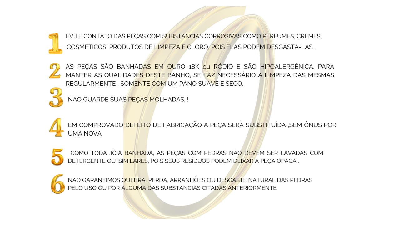 - Respeite o prazo de 30 dias e as normas de uso, especialmente para peças banhadas a ouro.